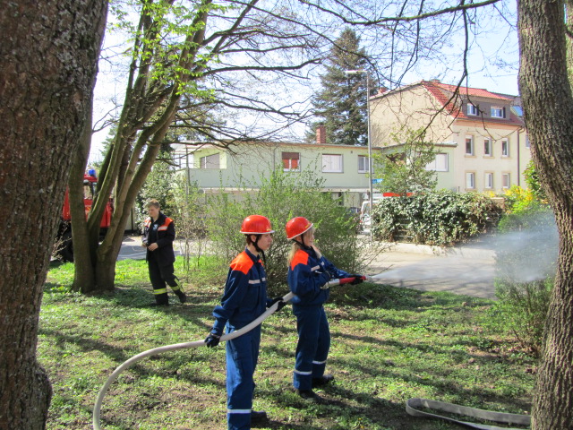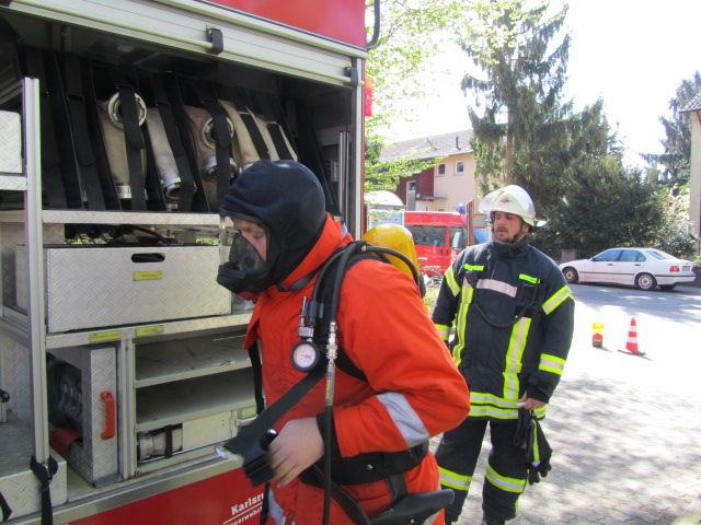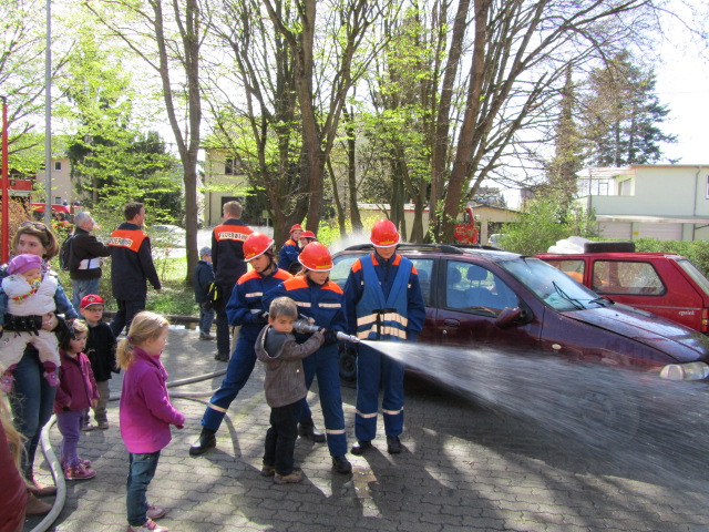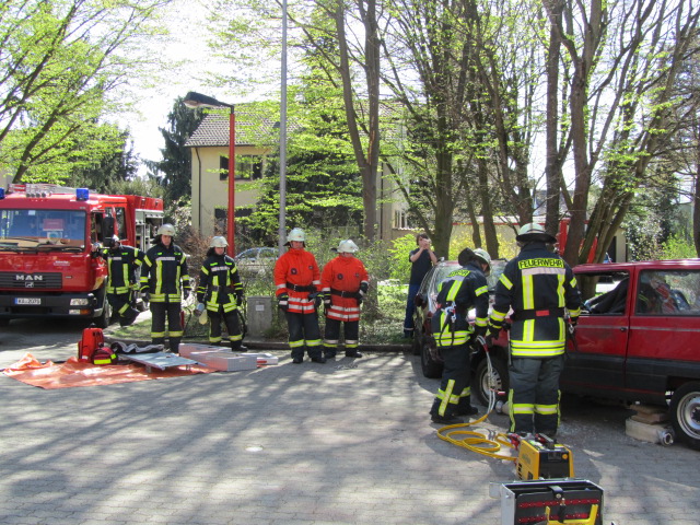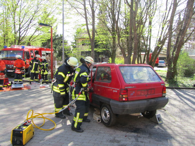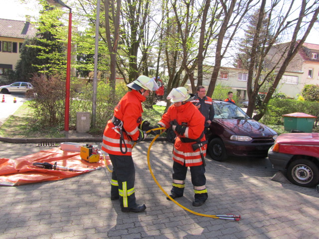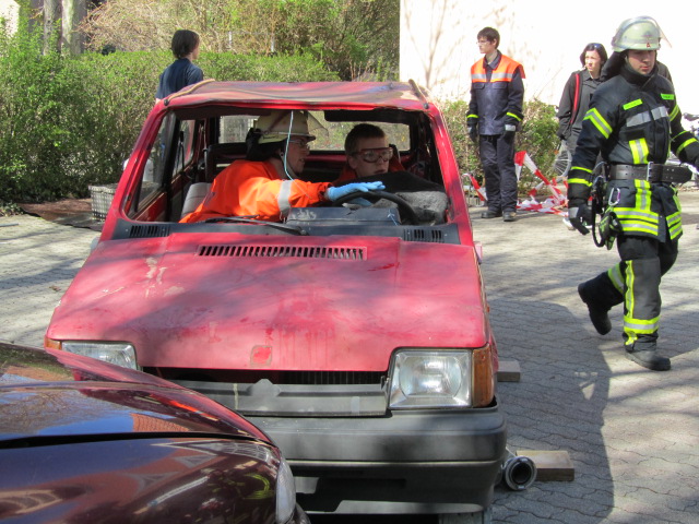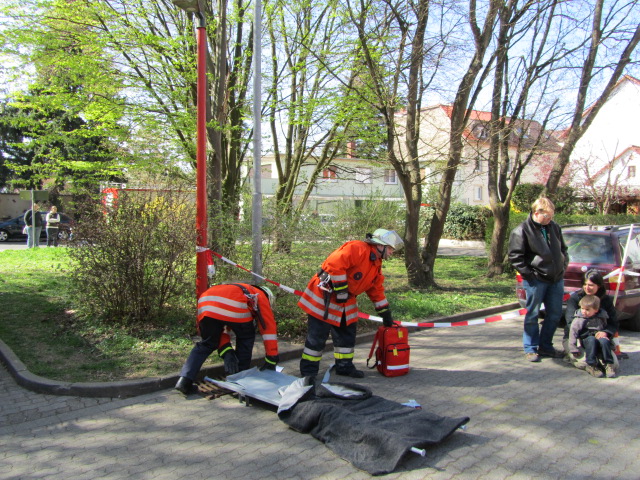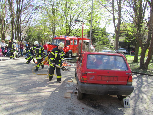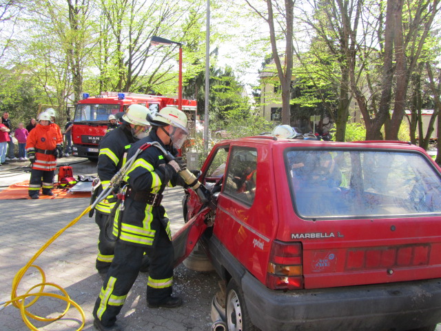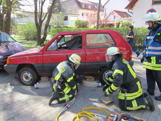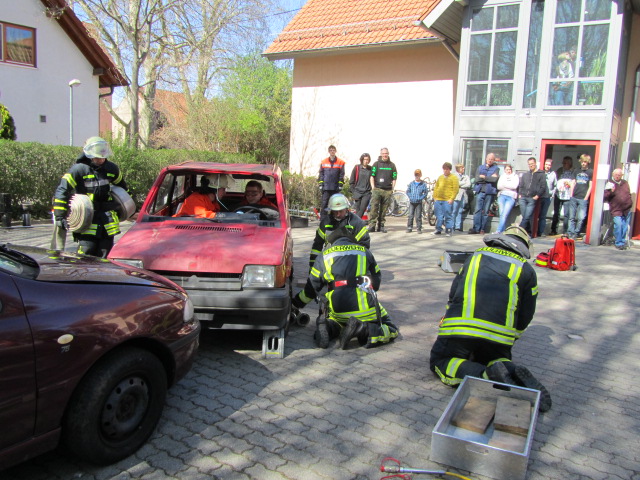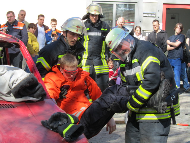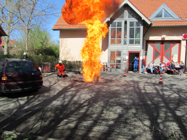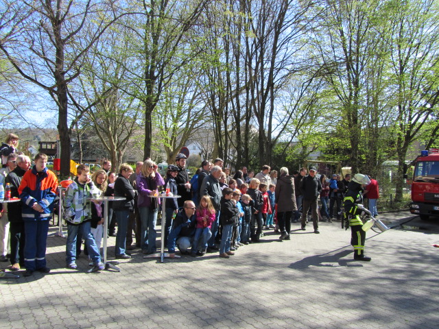 Um 11 Uhr eröffnete Abteilungskommandant Matthias Fuchs die Veranstaltung mit der Begrüßung der Gäste und gab den Startschuß für die erste Vorführung. Spätestens jetzt war klar, dass es sich nicht um einen Aprilscherz handelte wie von einigen Gästen im Vorfeld befürchtet worden war. Bei Sonnenschein und am Vormittag noch recht frühlingshaften Temperaturen sahen einige Familien die Vorführung zum Thema Fettexplosion und Spraydosenzerknall. Dies war wohl die Initialzündung. Der Hof des Gerätehauses füllte sich mit immer mehr Menschen, die den im Stundentakt stattfindenden Vorführungen der Kameraden zusehen wollten. Neben der Fettexplosion und dem Spraydosenzerknall standen noch das Absuchen von Räumen und die Rettung einer Person aus einem Unfallfahrzeug auf dem Programm. Damit aber nicht nur die aktiven Feuerwehrleute etwas zu schaffen hatten bestand nach den praktischen Übungen immer die Möglichkeit für die Erwachsenen auch einmal selber in die Rolle des Feuerwehrmannes zu schlüpfen und z.B. einmal mit dem Kombigerät zu arbeiten.