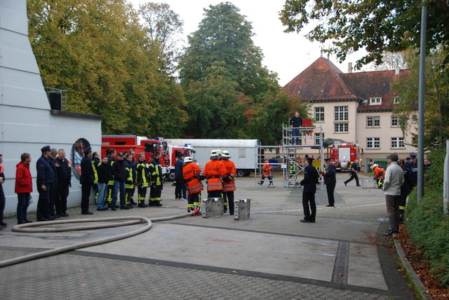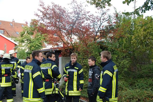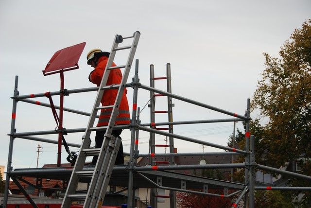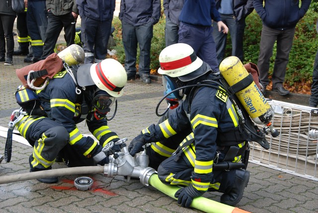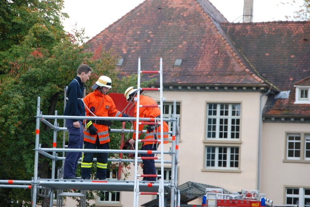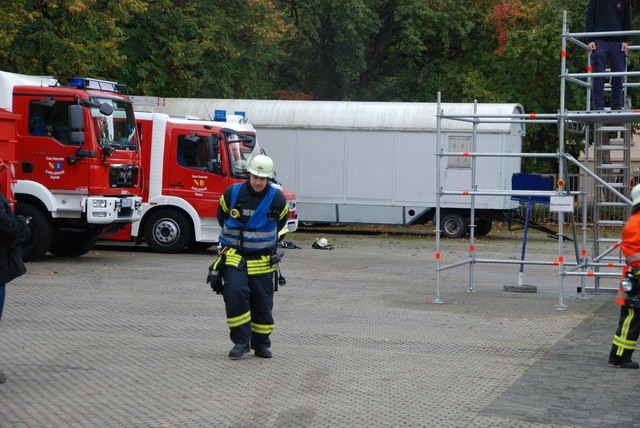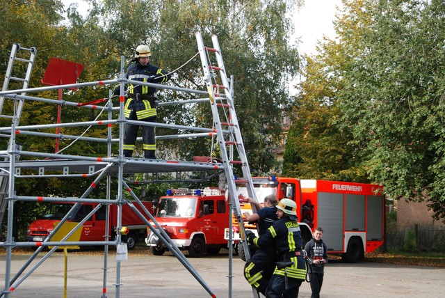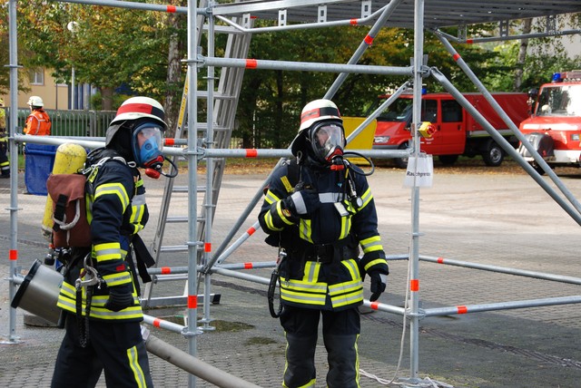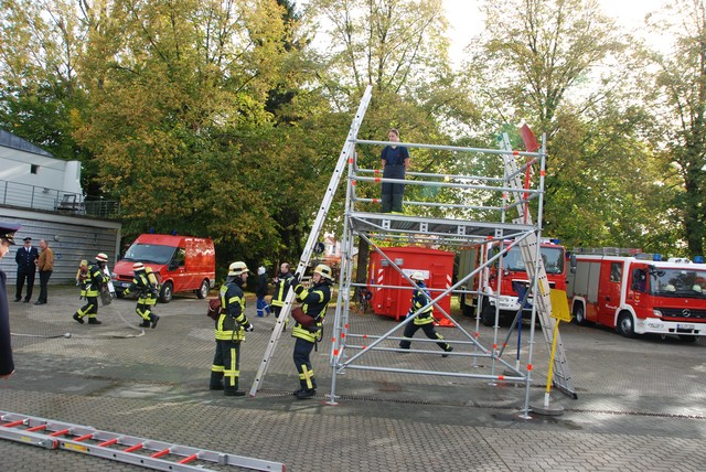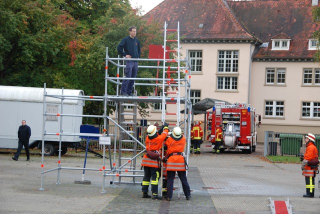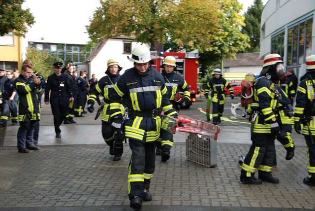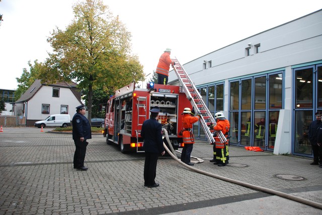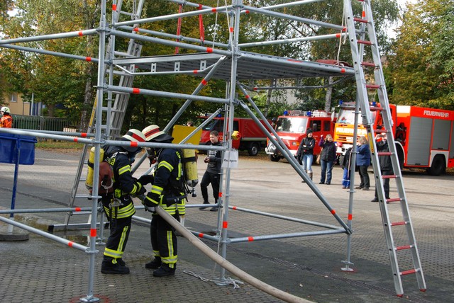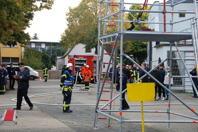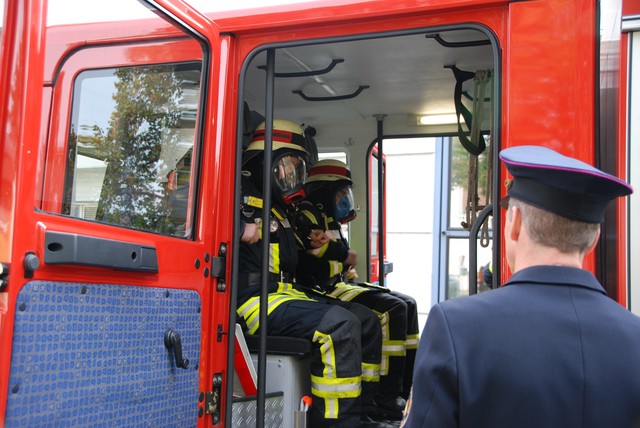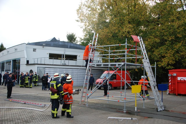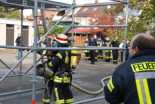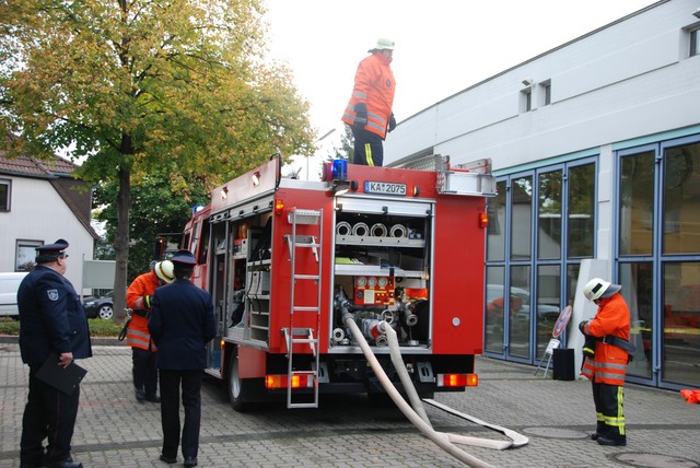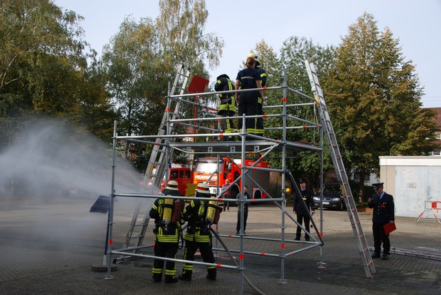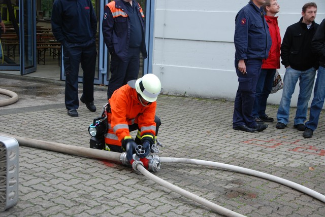 Nach mehrwöchigem intensivem Training zu dem man sich mehrmals pro Woche zusammengefunden hatte war es dann um 8:15 soweit, die Stunde der Wahrheit hatte geschlagen. Nach der Abnahme und Kontrolle des Fahrzeuges trat die Löschgruppe zur Abnahme an. Auf ein Kommando des Fahrzeugführers begann der Löschangriff. Alles klappte wie am Schnürchen. Neben dem Aufbau der Wasserversorgung und der Vornahme eines Strahlrohres wurde auch eine Leiter zur Menschenrettung gestellt. Nach knapp 6 Minuten war dann eine Person aus dem ersten Obergeschoß gerettet und das Feuer gelöscht, so dass der Fahrzeugführer Gefahr vorbei melden und die Übung beendet werden konnte. Jetzt hieß es für die angetretenen Teilnehmer warten, ob die Leistungsübung bestanden war.