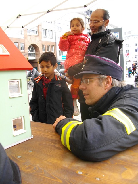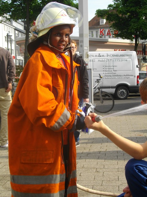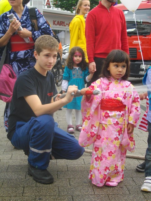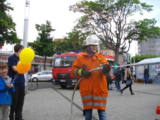 Am Samstag früh trafen sich dann 10 Kameraden aus Aktivität und Jugend und verluden die benötigten Materialien. Am Stephansplatz angekommen, wurde sofort mit dem Aufbau des Standes begonnen. Leider hatten wir dabei wenig Glück mit dem Wetter, da ein leichter Nieselregen eingesetzt hat. Schon während des Aufbaus hatten wir Gelegenheit, das Prinzip der Hilfe für den Nächsten, den anderen Vereinen näher zu bringen, indem wir für sie Stromkabel, welche nicht mehr in die auf dem Boden verlegten Kabelkanäle passten, kurzerhand durch Bäume als improvisierte Strommasten verlegten. Auf Grund des schlechten Wetters verschob sich dann der Festbeginn etwas. Es entwickelte sich ein fließender Übergang vom Aufbau zum eigentlichen Fest. Auf Grund der Wetterlage hielt sich der Besucherzustrom zu Beginn leider noch etwas in Grenzen. Erst gegen frühen Nachmittag klarte es dann auf und die Sonne erschien. Da zeigte sich dann, dass wir mit unserer Idee ein Feuerwehrspritzspiel mitzunehmen, gold richtig lagen. Um dieses und um das ausgestellte Feuerwehrauto bildeten sich große Schlangen. Die Faszination für große rote Feuerwehrautos scheint bei Kindern aller Nationen gleichermaßen vorhanden zu sein. Immer wieder ergab sich auch die Gelegenheit sich mit ihren Eltern zu unterhalten und ein wenig über den Gedanken der Freiwilligen Feuerwehr, über Rauchmelder oder die Möglichkeiten des Brandschutzes in den eigenen vier Wänden zu informieren. Es war schön zu sehen, das Kinder Brücken gebaut haben, die die Erwachsenen nur noch beschreiten mussten, um miteinander ins Gespräch zu kommen.