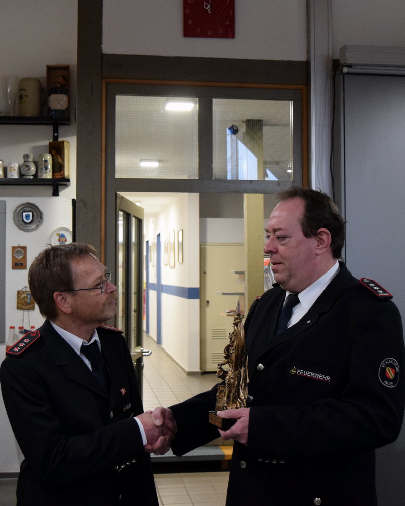 In seinem Jahresrückblick erinnerte Matthias Fuchs an die 47 Einsätze und die Übungsdienste, die von der Abteilung Aue bewältigt wurden. Gerhard Schneider, Mitglied der Alters- und Ehrenabteilung, wurde für seine 60-jährige Mitgliedschaft in der Abteilung geehrt. Ronald Richter berichtete über den Baufortschritt der neuen Hauptfeuerwache der Berufsfeuerwehr, der bereits einen Umzug im Jahr 2020 ermöglicht, und Fahrzeugbeschaffungen, durch die in den nächsten Jahren drei Fahrzeuge der Abteilung Aue ersetzt werden. Außerdem konnten von ihm sechs Feuerwehrkameraden für ihre Dienstzeit und geleistete Arbeit befördert werden.