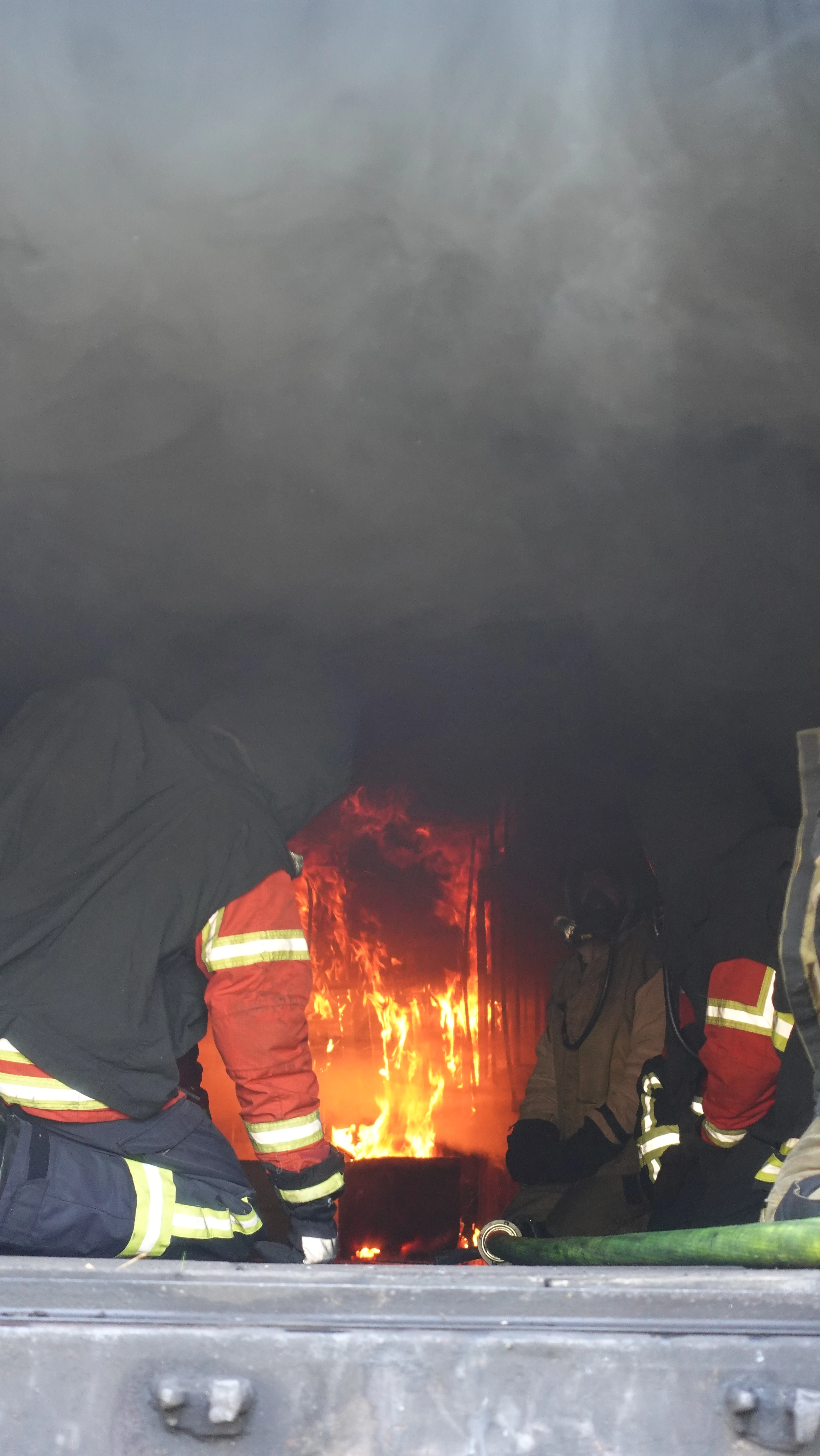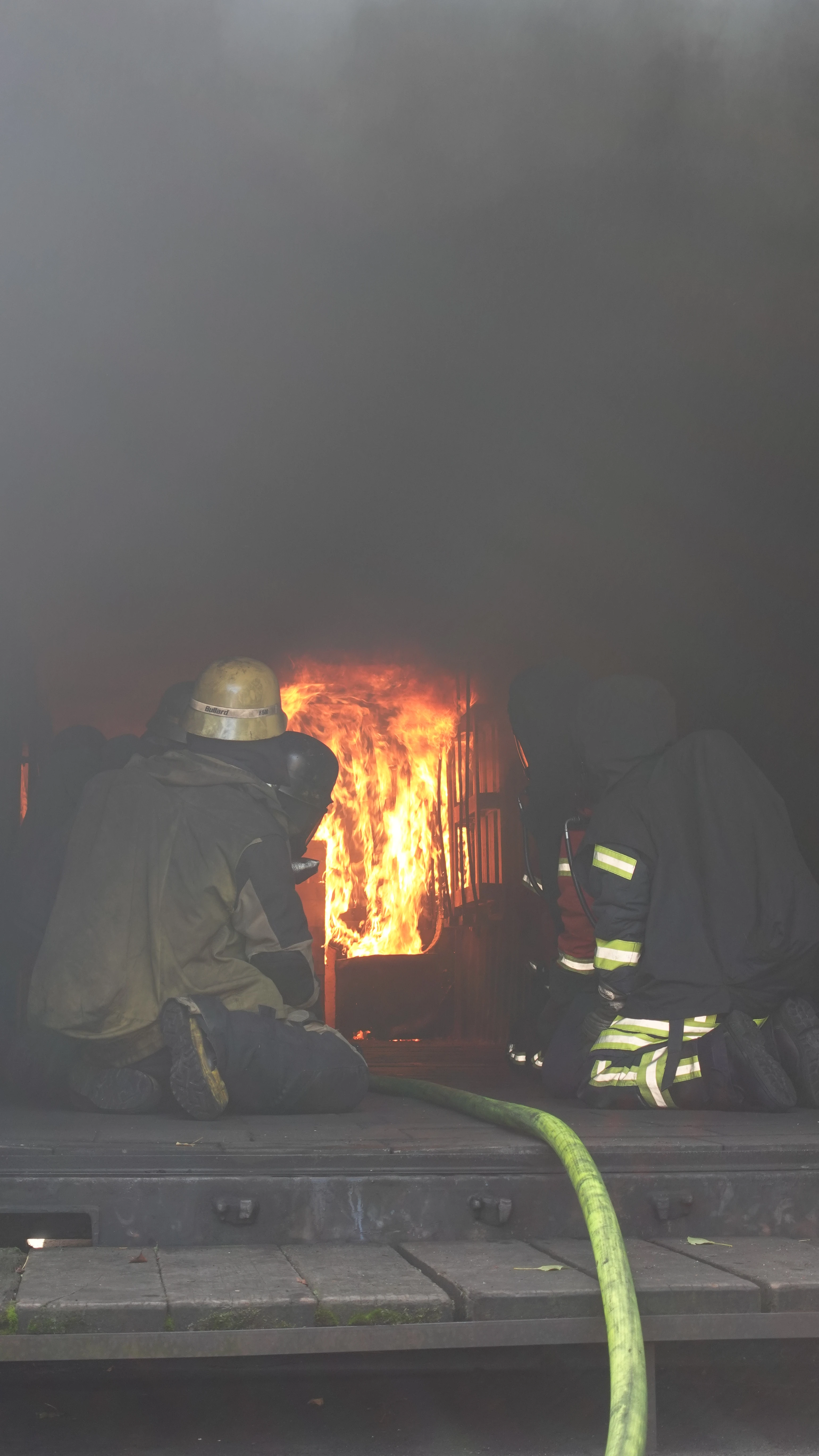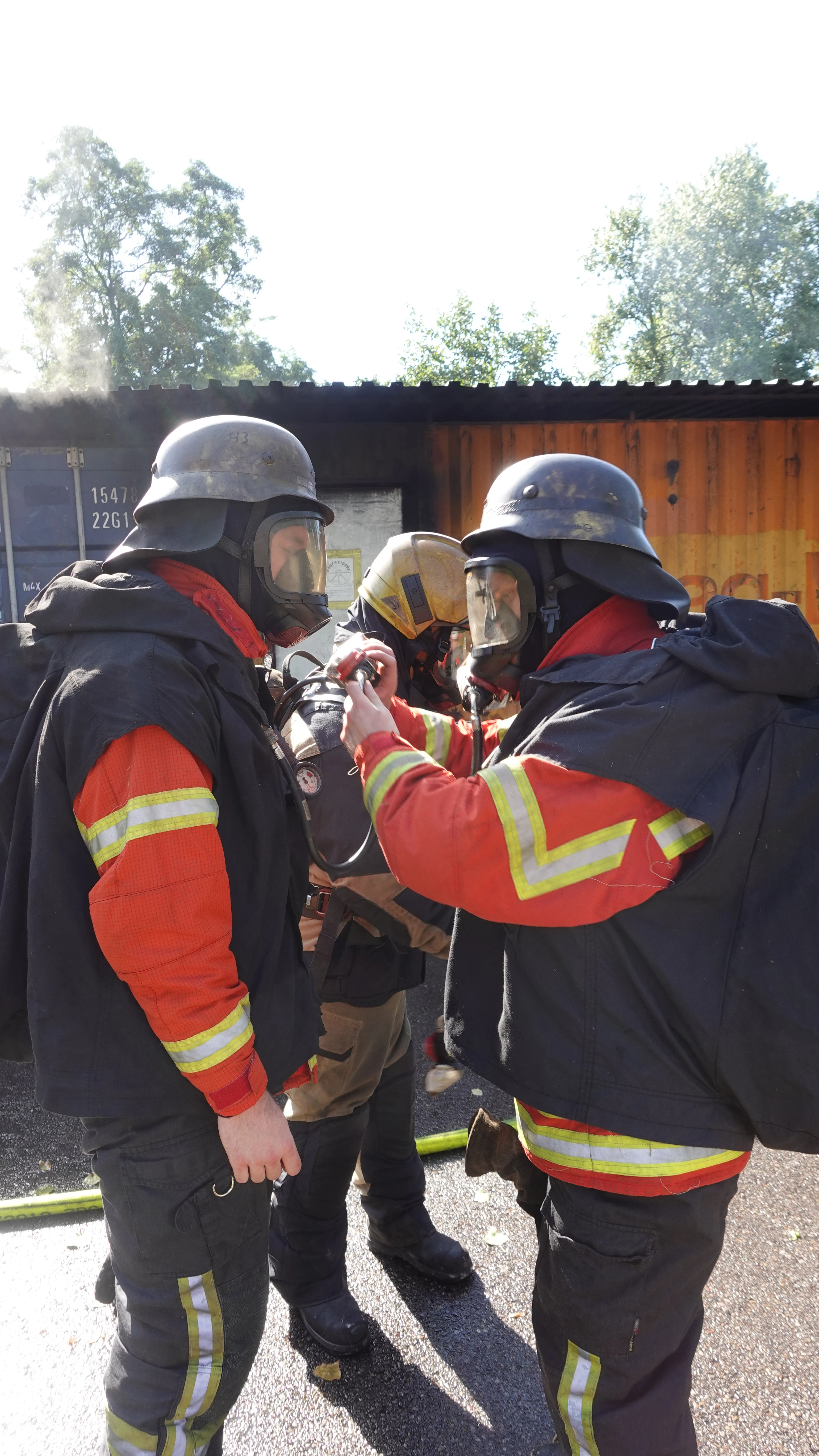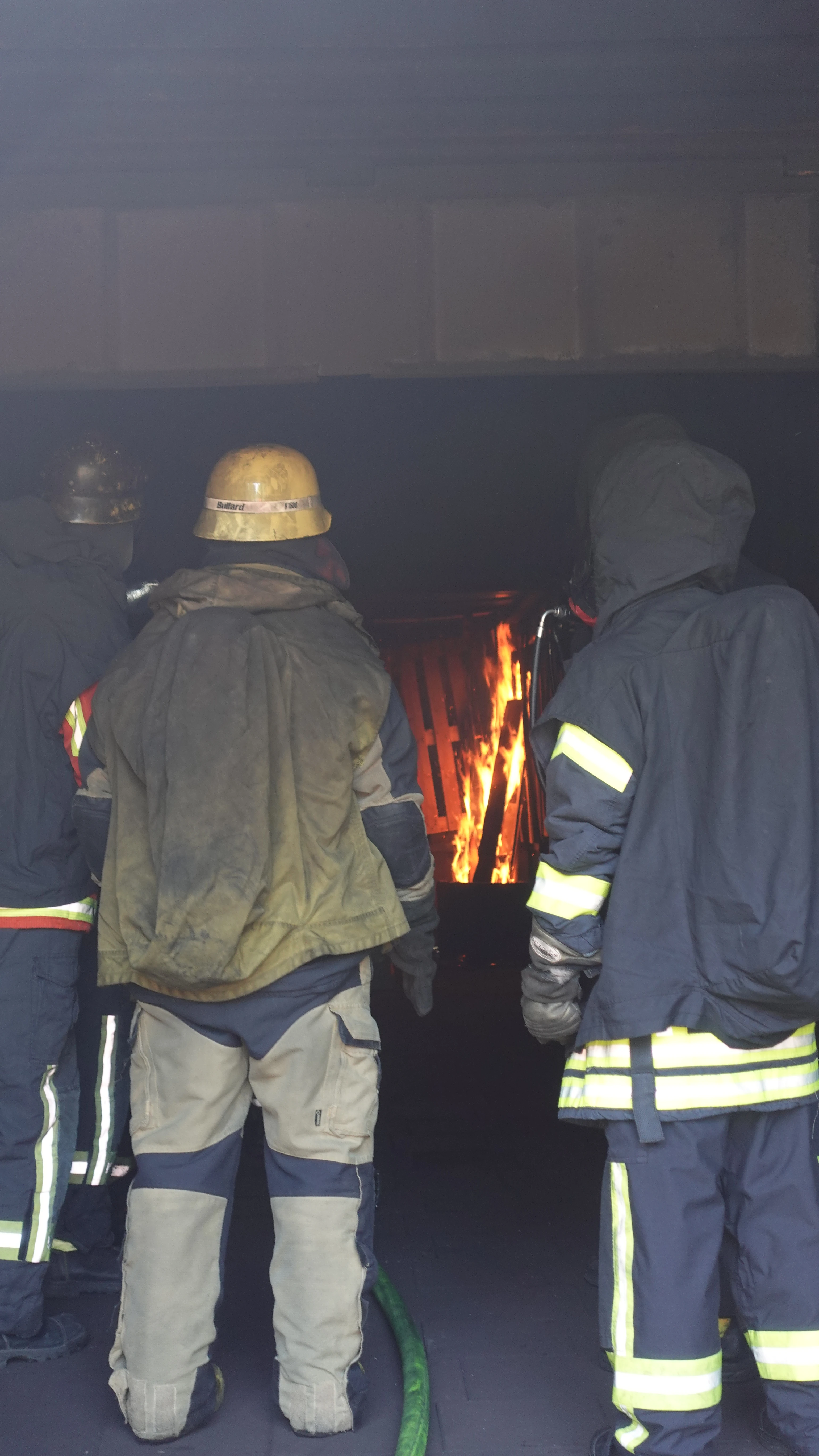 Von der normalen Ausbildung bei uns am Standort unterscheidet sich dort, dass brennende Holzpaletten das Feuer eines echten Einsatzes darstellen. Zu Beginn konnten die Einsatzkräfte dort nicht nur die Brandausbreitung vom Entstehungsbrand bis zum Vollbrand beobachten, sondern auch die Grenzen Ihrer Uniform und die Hitze in der Anlage spüren.