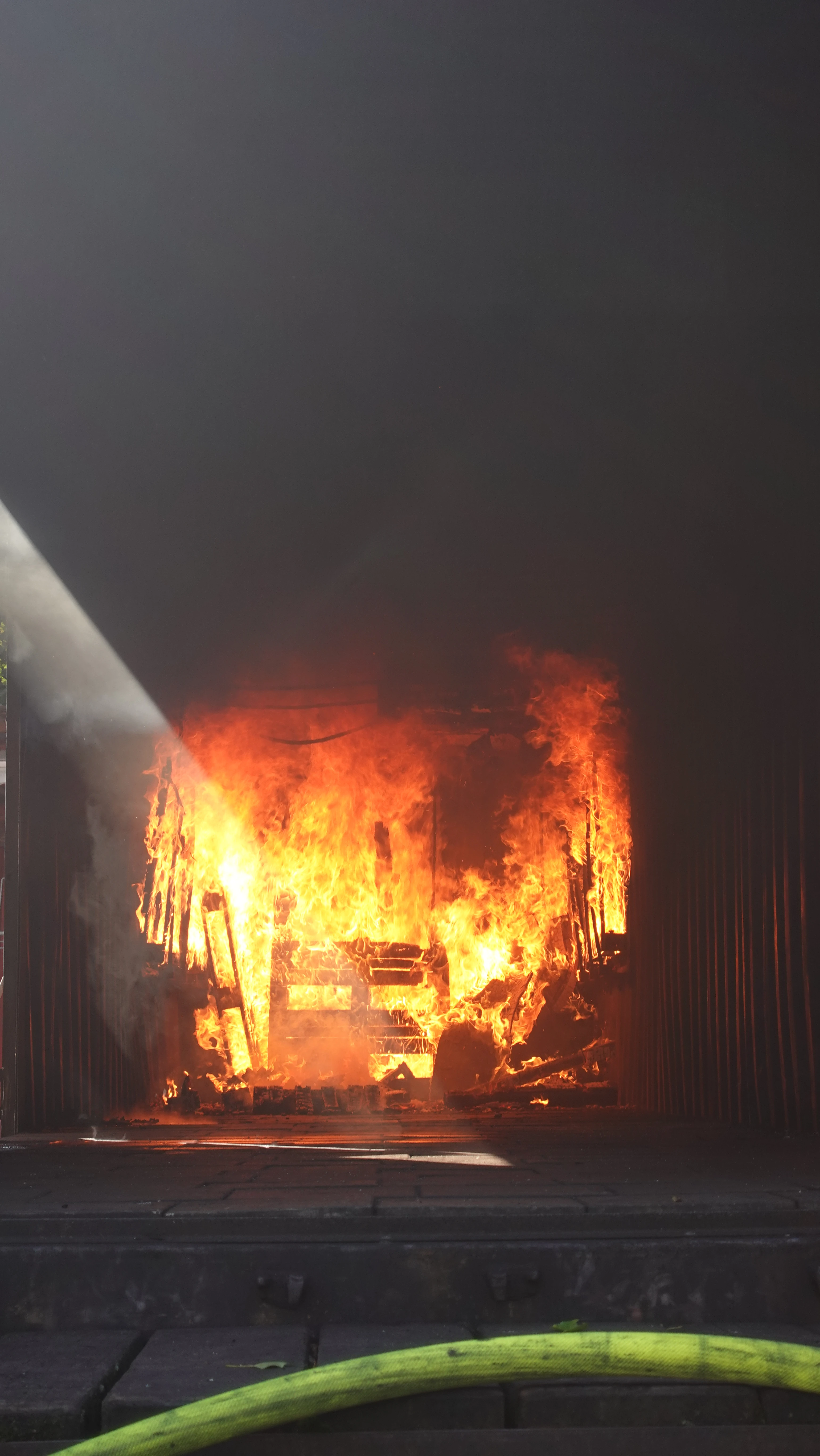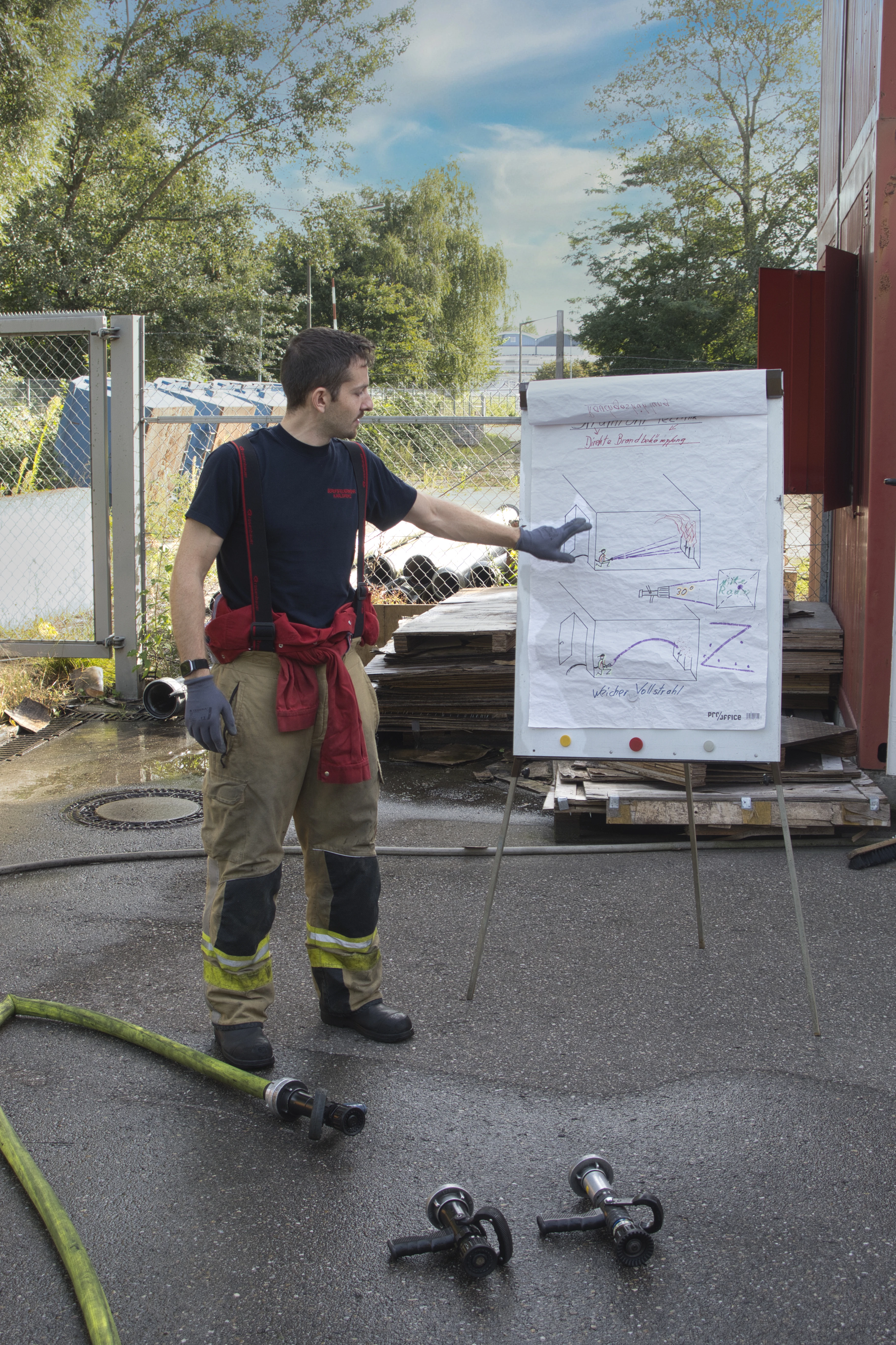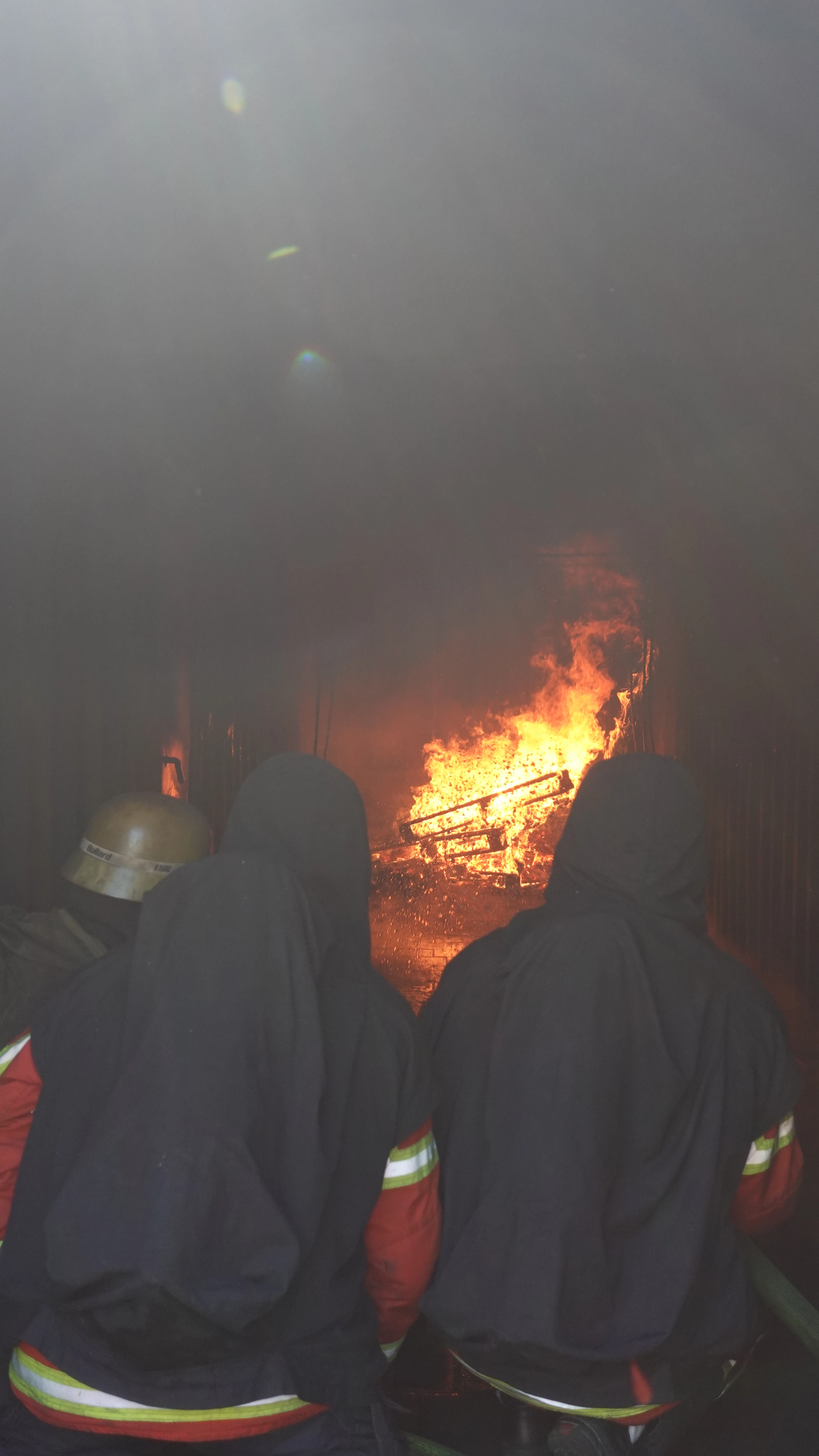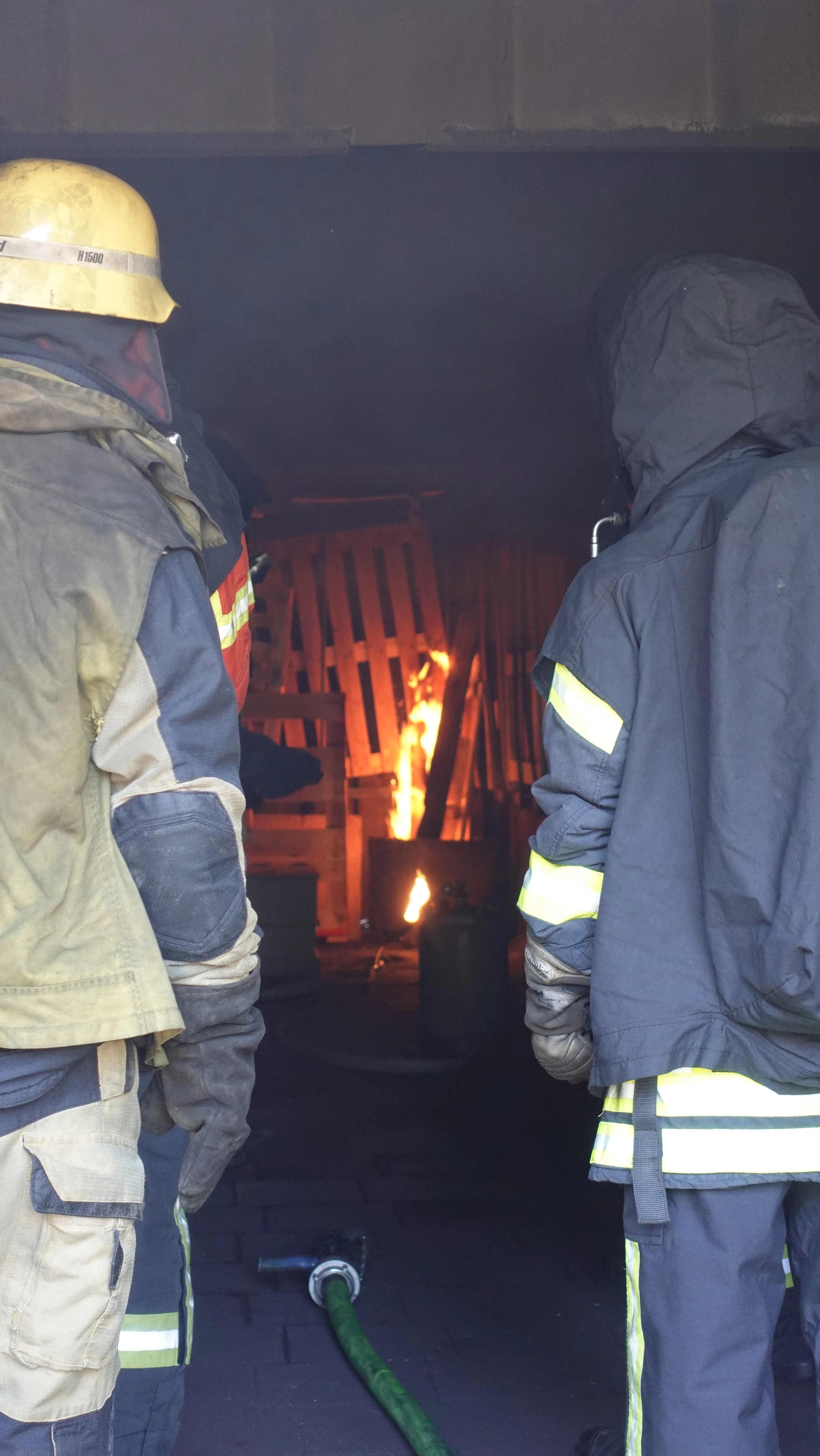 Von der normalen Ausbildung bei uns am Standort unterscheidet sich dort, dass brennende Holzpaletten das Feuer eines echten Einsatzes darstellen. Zu Beginn konnten die Einsatzkräfte dort nicht nur die Brandausbreitung vom Entstehungsbrand bis zum Vollbrand beobachten, sondern auch die Grenzen Ihrer Uniform und die Hitze in der Anlage spüren.