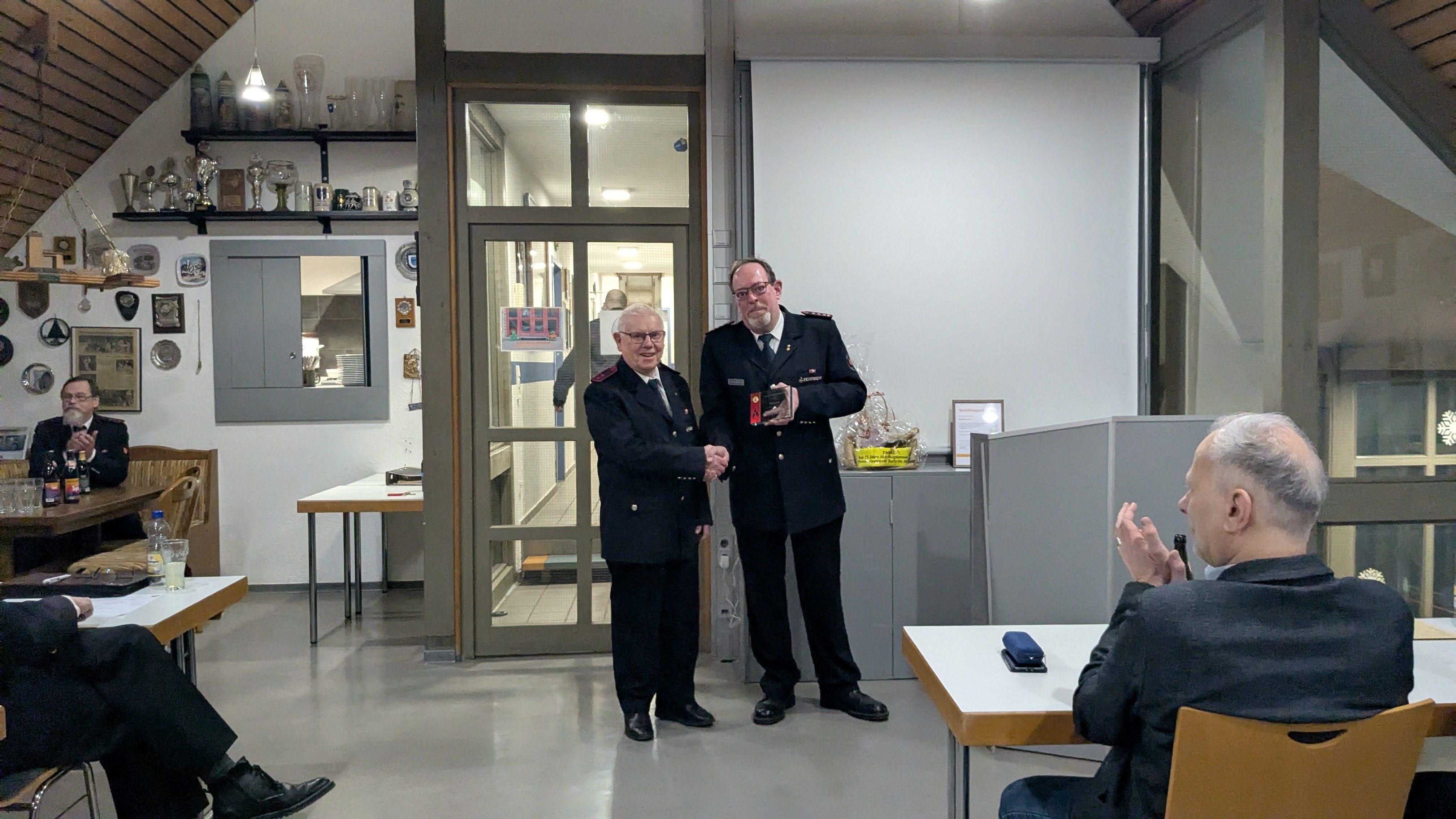 Bild 1: Matthias Fuchs wurde zum Ehrenkommandanten ernannt. Zudem erhielt er die Ehrennadel der Stadt Karlsruhe sowie die Ehrung der Abteilung für jeweils 30 Jahre Mitgliedschaft. Christian Bräuer wurde zum neuen Abteilungskommandanten gewählt. Alexander Geiger wurde erneut als stellvertretender Abteilungskommandant bestätigt.