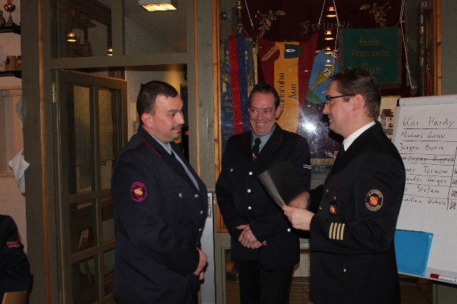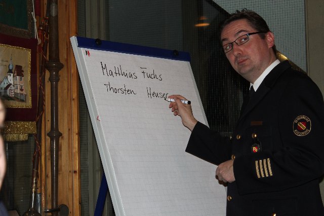 Nach den obligatorischen Berichten über das abgelaufene Jahr wurden Matthias Fuchs als Abteilungskommandant sowie Thorsten Heuser als sein Stellvertreter mit großer Mehrheit gewählt. Auch der Feuerwehrausschuss wurde neu gewählt. Die Mehrheit der Stimmen fielen auf J. Born, M. Grau, K. Hardy und M. Kohnle.
