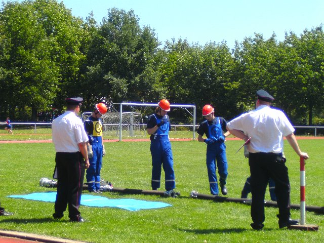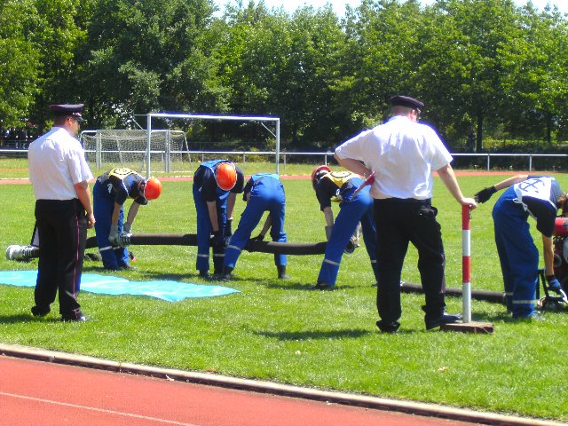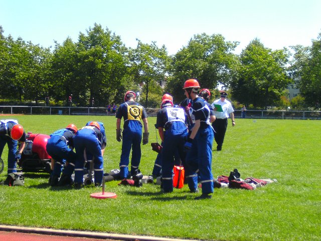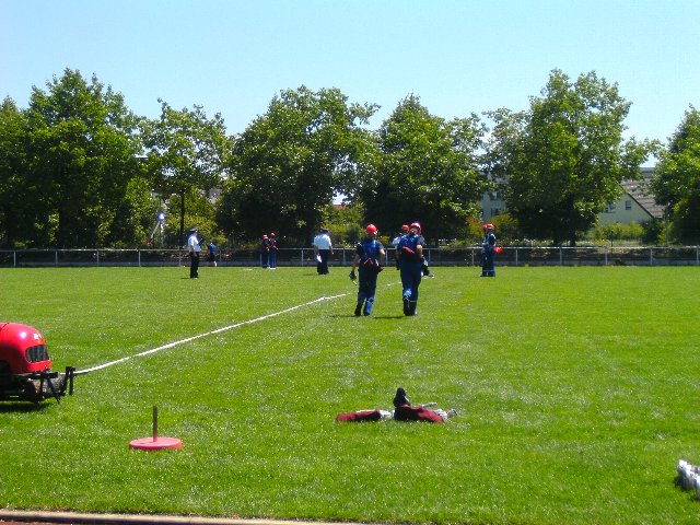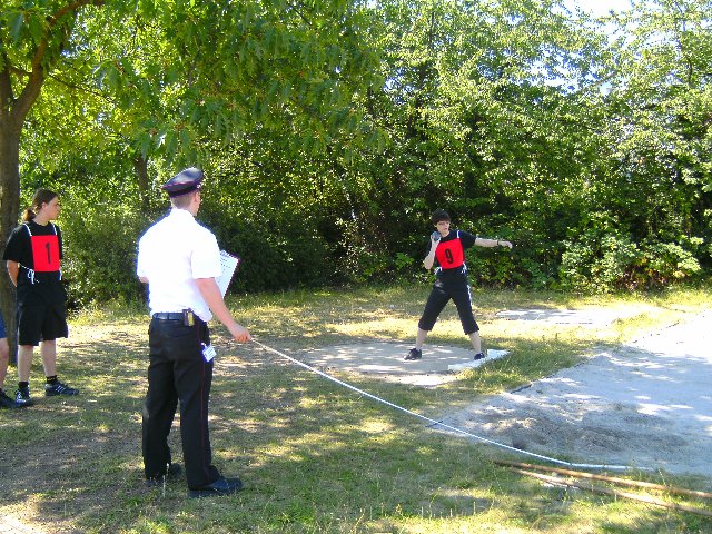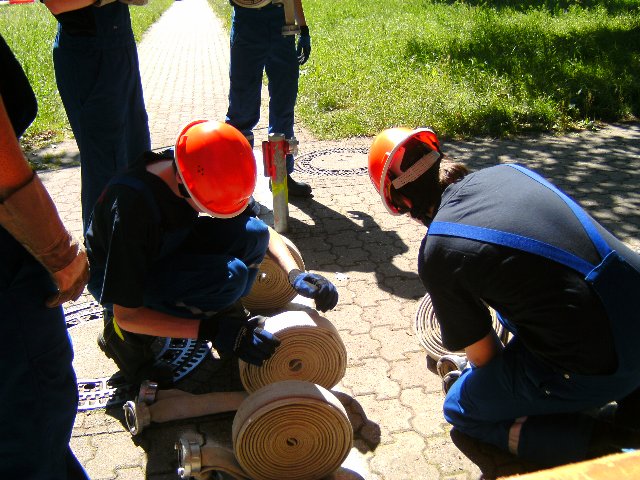 Unsere Gruppe, die auch mannschaftsintern „GrAue“ genannt wurde, entschied sich dazu, als Erstes zum Staffellauf anzutreten. Nachdem wir unsere „Problem-Station“ bewältigt hatten, lief weiterhin auch alles reibungslos. Als zweite Disziplin wurde Kugelstoßen ausgewählt. Anschließend traten wir zur Schnelligkeitsübung an, bei der die Mannschaft acht Schläuche so schnell wie möglich ausrollen und kuppeln musste. Danach bewältigten wir den Löschangriff „Blockhaus“, bei dem eine Saugleitung und ein Löschangriff mit drei C-Rohren erforderlich waren. Die letzte Hürde bestand aus der Frage-Runde. In dieser mussten wir Fragen über Feuerwehr und Allgemeinwissen vor zwei Wertungsrichtern beantworten.